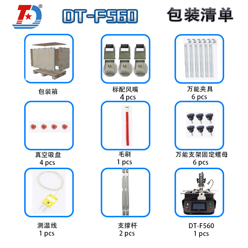 5、选用高精度K型热电偶闭环控制,外置测温接口实现对温度的精密检测,PCB板定位采用V字形槽,灵活方便的可移动式万能夹具对PCB板起到保护作用,防止PCB边缘器件损伤及PCB变形,并能适应各种BGA封装尺寸的返修。